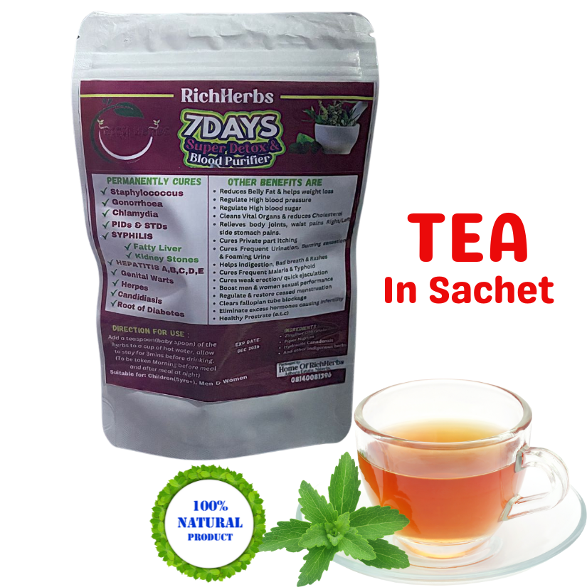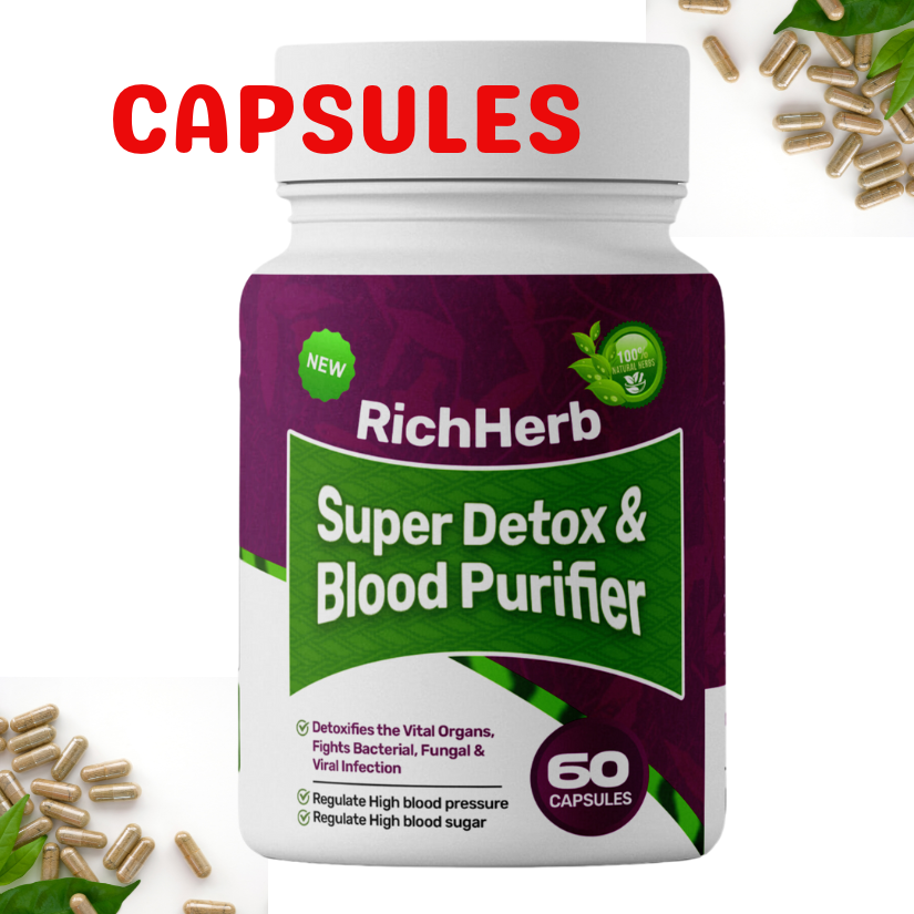 Rich Herbs Super Detox & Blood purifier is trusted by thousands of Nigerian for faster healing. It is a natural herbal formula made from a powerful mix of locally sourced and international botanicals, blended in to CAPSULES and TEA to help Detoxify Liver, kidneys & intestines, Purify your blood from harmful substances, improve digestion & metabolism, Boost Energy and restore balance, Support skin clarity and Immune function, Stabilize sugar level & Blood pressure, supports prostate health and restores normal function. etc