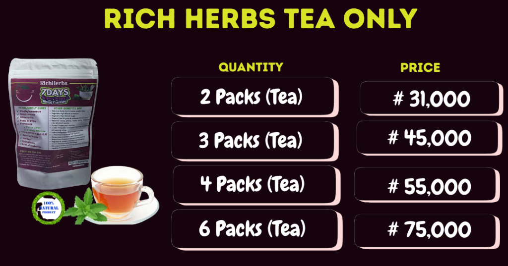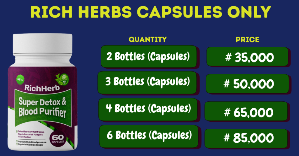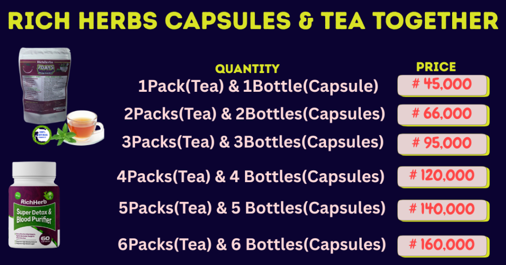 Rich Herbs Super Detox & Blood purifier is trusted by thousands of Nigerian for faster healing. It is a natural herbal formula made from a powerful mix of locally sourced and international botanicals, blended in to CAPSULES and TEA to help Detoxify Liver, kidneys & intestines, Purify your blood from harmful substances, improve digestion & metabolism, Boost Energy and restore balance, Support skin clarity and Immune function, Stabilize sugar level & Blood pressure, supports prostate health and restores normal function. etc